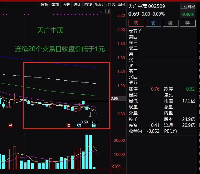 深交所的公告显示,2020年4月9日至2020年5月11日,天广中茂的股票连续二十个交易日的每日收盘价均低于股票面值(1元)。上述情形属于深交所相关规定的股票终止上市情形(退市情形)。