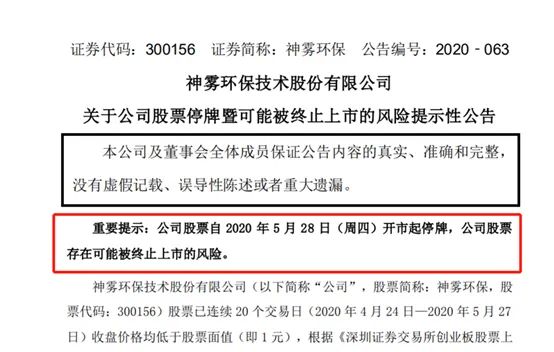 5月27日晚间,神雾环保发布公告,公司股票自 2020 年 5 月 28 日(周四)开市起停牌,存在可能被终止上市的风险。