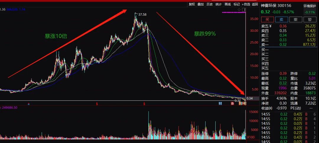 从股价高位下来,3只股票均跌幅超90%,曾经的大牛股神雾环保更是暴跌逾99%,从2017年3月高位37.58元(前复权),到今年5月27日跌至0.32元,跌幅高达99.15%。