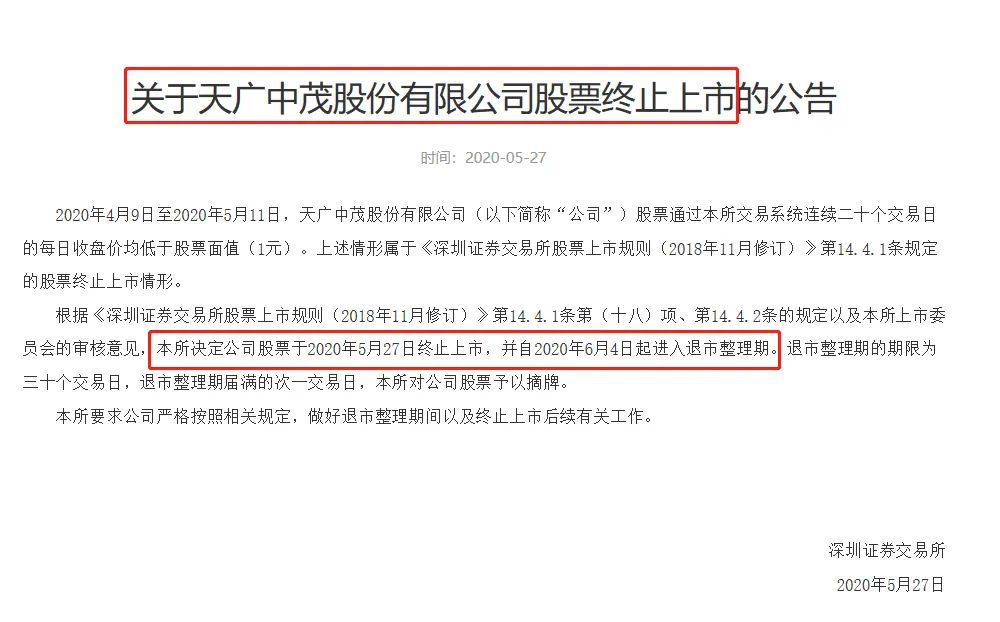 5月27日晚间,深交所公告,天广中茂被终止上市,也就是遭强制退市。