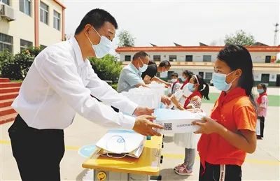 ■近日,山东省工信厅驻山亭区凫城镇田庄村第一书记赵刚(左一)购买了装有铅笔、本子、口罩等学习及防疫用品的礼盒袋,免费发放给当地小学生们,共同迎接“六一”国际儿童节的到来。(王启蒙 摄)