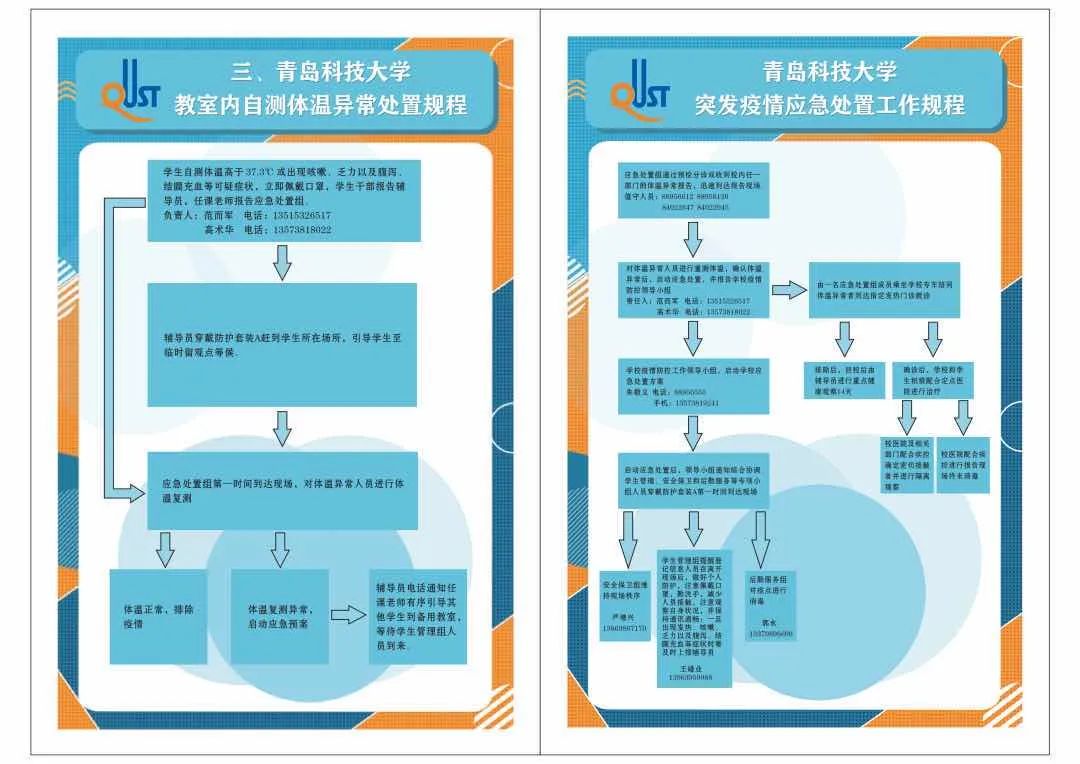 一人一码一卡一测温——为全力维护校园安全秩序,青科大严防死守校门管控,严格落实各入口“一人一码一卡一测温”的管控程序,不符合入校规定的严格禁入。根据山东省委重点人群“应检尽检”的指示精神,青岛科技大学对返校重点人群全部进行核酸检测。在检测结果出来之前,对学生按照“一人一舍”进行隔离观察,同一宿舍的同学由辅导员提前通知调整到备用宿舍,检测结果为阴性的解除隔离。在学生返校前,青岛科技大学举行了4次疫情防控应急处置演练,涵盖学生返校时校门管理、宿舍运行、餐厅就餐、课堂运行、应急处置演练等五个部分,通过真实场景的演练,让广大师生熟练掌握操作规程,及时发现各个环节存在的问题,完善疫情防控方案。