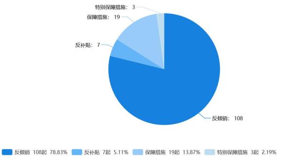 根据中国贸易救济信息网和印度商工部官方的数据显示,2010年至2020年,印度对中国发起的贸易救济案件中,反倾销共108起,占比78.83%,具体信息如下图所示: