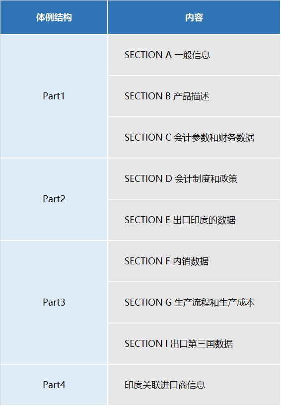 原先的出口商调查问卷主文部分共有A-K等11个部分,具体包括:1)A.一般信息(General);B.销售(Sales);C.价格结构和销售安排(Price Structures & SalesArrangement);D.投资和基本建设(Investments);E.会计政策和制度(Accounting System & Policies);F.生产过程(Production Process);G.生产成本(Information on COP);H.利润确定(Profit Determination);I.财务信息(Financial Info.);J.第三国信息;K.计划和潜在产能信息。最新的出口商调查问卷,则将问卷整体分为Part1、Part2、Part3和Part4等四个部分,每个部分包含若干子项,其结构为: