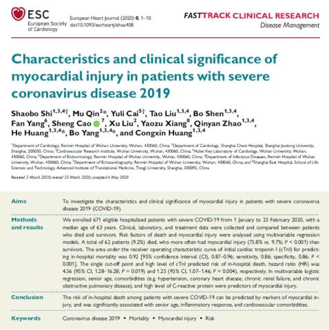[1]Shaobo Shi, Mu Qin, Yuli Cai, Tao Liu, Bo Shen, Fan Yang, Sheng Cao, Xu Liu, Yaozu Xiang, Qinyan Zhao, He Huang, Bo Yang, Congxin Huang, Characteristics and clinical significance of myocardial injury in patients with severe coronavirus disease 2019, European Heart Journal, ehaa408,