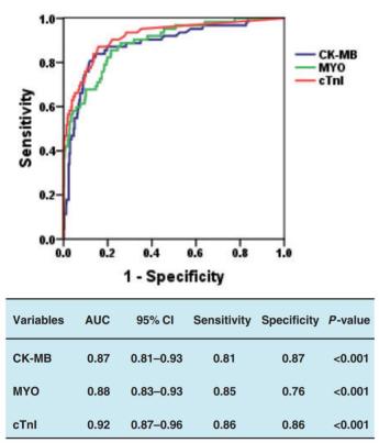 这项队列研究共纳入了在武汉大学人民医院住院治疗的671例重症COVID-19患者,分析显示,入院时的心肌标志物对院内死亡具有良好的预测价值,其水平越高,院内死亡风险越大,其中肌钙蛋白的预测价值最高,受试者工作曲线下面积达0.92,敏感性和特异性均为86%。
