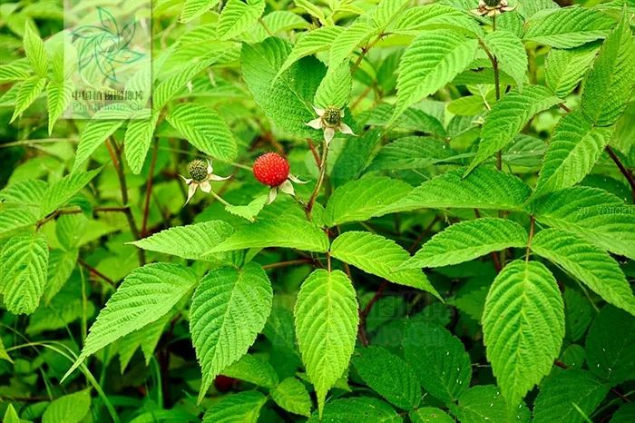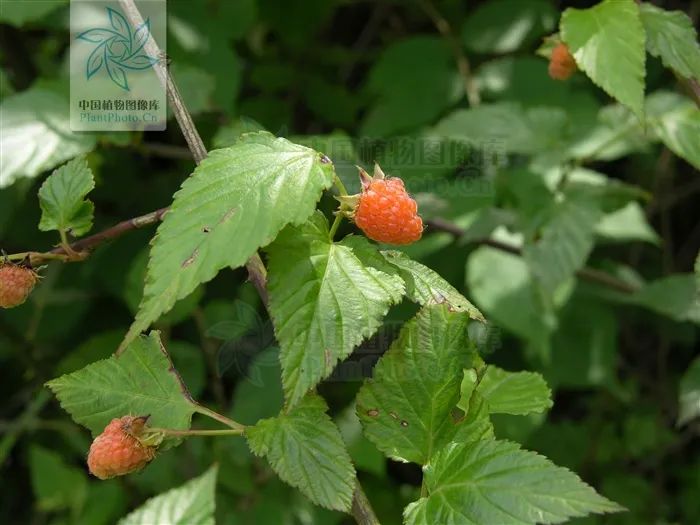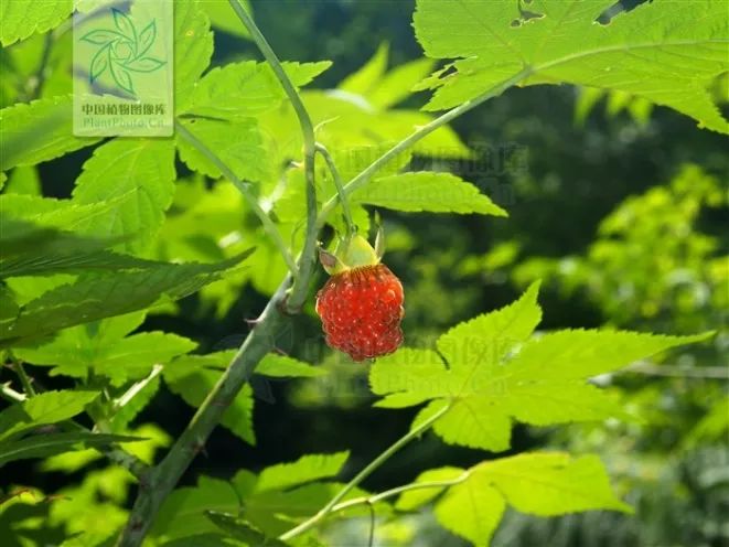 既然覆盆子的名字出现过变化,那么覆盆子的基原变迁又是如何呢?北宋《本草图经》有详细描述:“苗短不过尺,茎、叶解忧刺,花白,子赤黄如半弹丸大,而下有茎承,如柿蒂状,小儿多食其实。”所描述的覆盆子为低矮草本,茎叶有刺,果实红色可食,即为现今的蓬虆,见下图(中国植物图像库)。蓬虆果实中空,果生枝顶,更像一个“覆盆”。