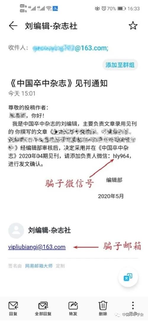 3)假冒我刊工作人员与科研工作者或临床医生联系组稿或约稿事宜。
