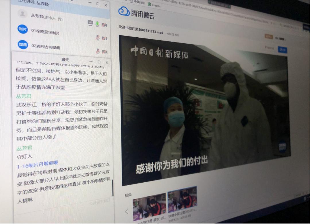 “虽然工作强度很大,也很累,但这样做值得,我一直坚持用创作反哺教学”,丛老师诚恳地说。她和同学们分享了这次特殊经历:如何在短时间内完成从选题策划、与多位采访对象“云采访”,到形成节目文案、与演播室大屏设计和技术人员等沟通完成录制,及后期“云看片、云修改”。在这一过程中,同学们通过丛老师的分享,对重大选题拆解和执行的全流程做了观摩,并有了深入的思考。