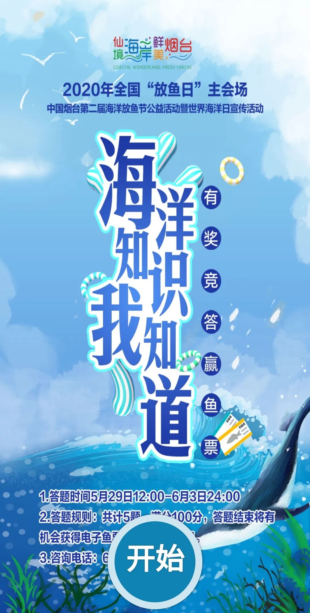 扫码关注烟台水母网(yt-shm)微信,点击菜单栏“2020放鱼节”或回复“答题”,进入答题页面。参与线上答题活动,领取电子鱼票,活动当天,在现场凭电子鱼票兑换纸质鱼票,至沙滩放鱼点领取鱼苗。(回复关键字“我的鱼票”可以查看已经获得的电子鱼票哦~)