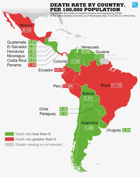 目前,拉美国家的确诊病例和死亡病例都在快速增长,巴西、秘鲁、智利、墨西哥、厄瓜多尔、多米尼加等国都受到了较大冲击。不过不同国家之间的确诊病例数和死亡病例数也很难进行比较,一方面因为各国的测试能力存在着一定差别,另一方面在不同时间段内各国政府的测试意愿与测试努力也有较大差异。此外,不同国家对如何定义因新冠疫情造成的死亡存在分歧,这就在一定意义上限制了数据的可比性。