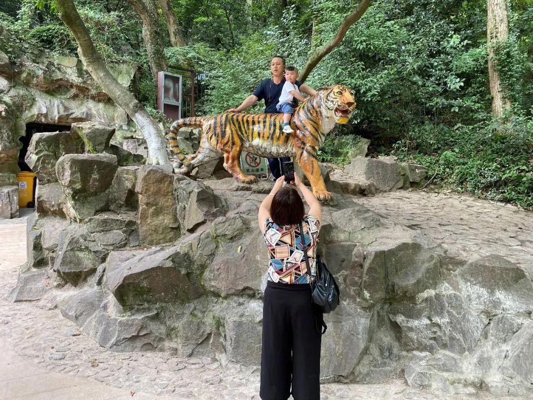“门票这么贵,照片总要拍一张的咯。”我被爸爸“强制”地扶上石虎,撑在虎背上的双手微微在抖,一边听着山洞里回荡的虎啸声,一边总担心身下的老虎会突然动起来。那张表情哭笑不得的照片,至今仍是全家人的笑料。