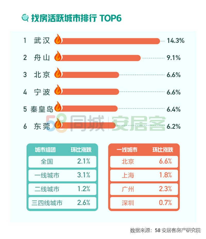 58同城、安居客对全国重点城市监测数据发现,找房活跃城市排行TOP6分别为武汉、舟山、北京、宁波、秦皇岛和东莞,其中武汉找房热度环比上涨14.3%,排名第一。全国城市来电量和主动在线微聊用户数也进一步印证了武汉楼市的火爆,5月全国城市来电量排名中,武汉以33.8%的环比涨幅遥遥领先,武汉5月全国主动微聊用户数也出现环比涨幅29.5%的形势。