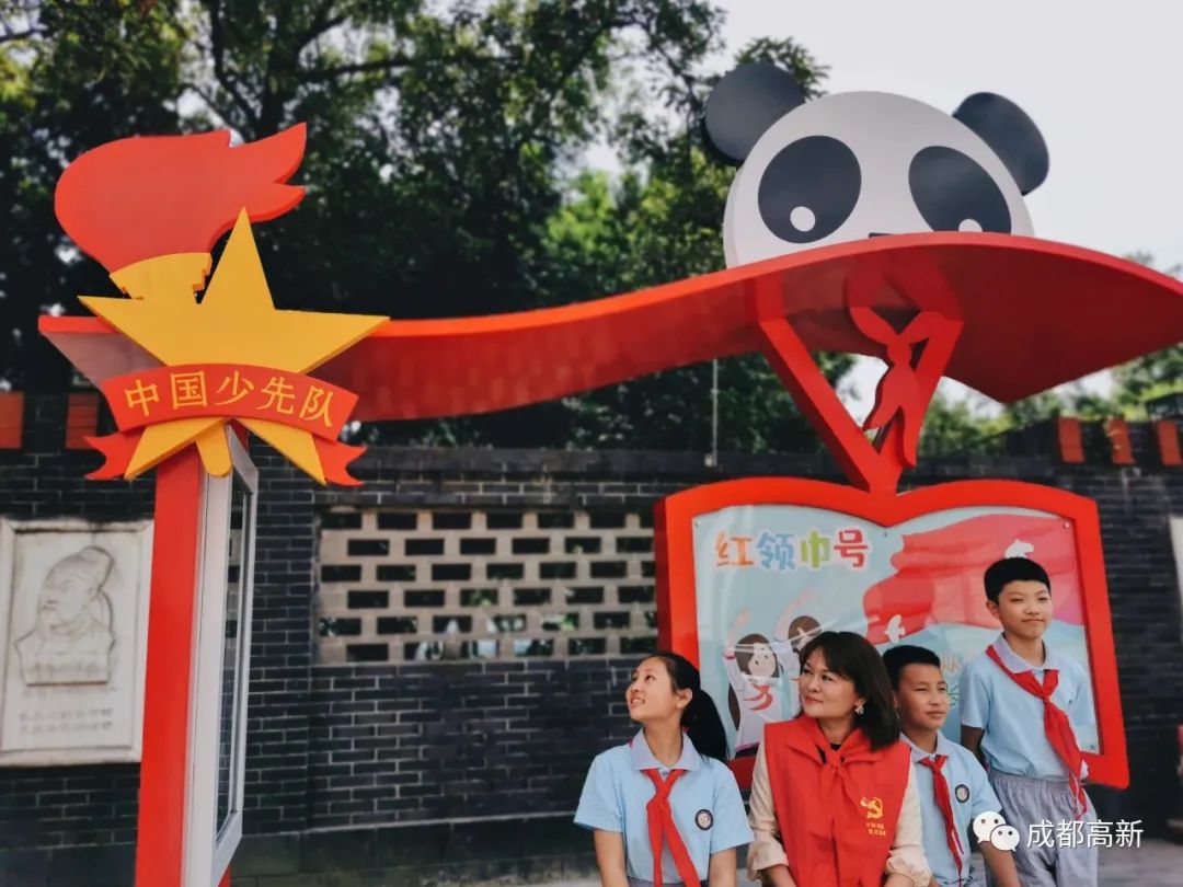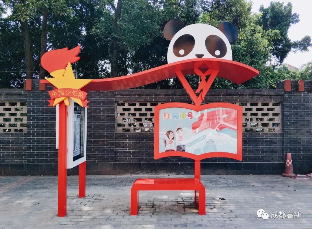 “红领巾号”公交站台最突出的,便是左上角的队徽和右上角的熊猫头像,既体现少先队元素,又融入了天府文化,在灰墙绿树的背景下十分亮眼。