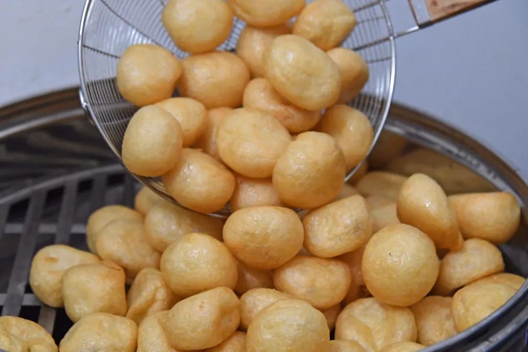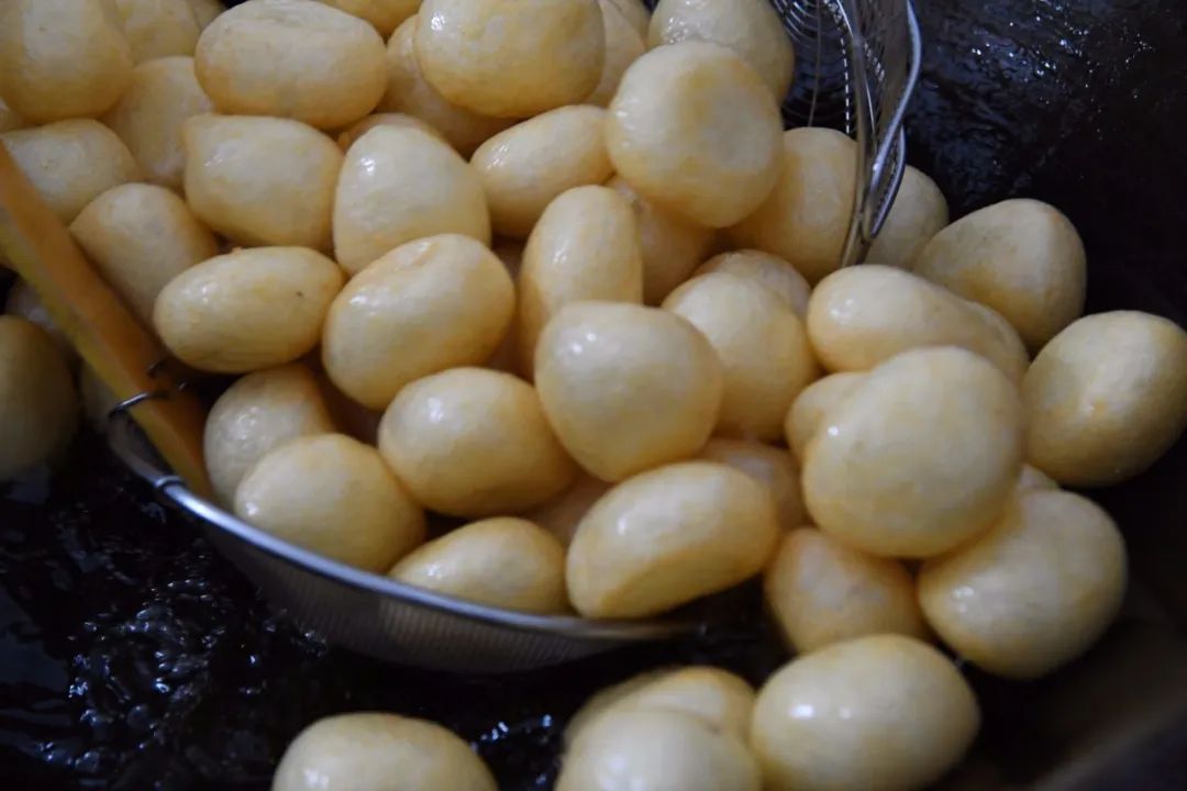 3.热锅宽油,大约七八成热的时候,将已制好的鱼肉用匙羹挤成小球形,一个个地放下油锅。油炸过程中需不断搅动、翻拌,使鱼腐受热更加均匀;
