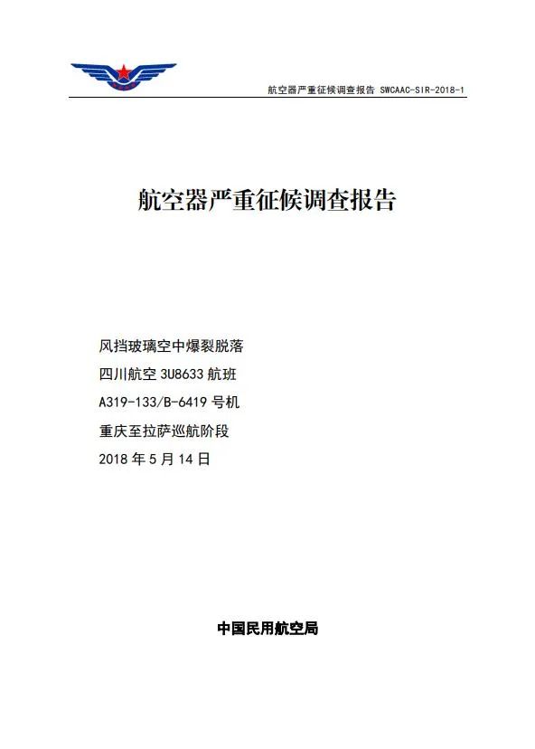 6月2日,中国民用航空安全信息系统发布2018年5月14日川航A319-100/B-6419号机执行3U8633重庆至拉萨航班风挡玻璃空中爆裂脱落事件的调查报告。