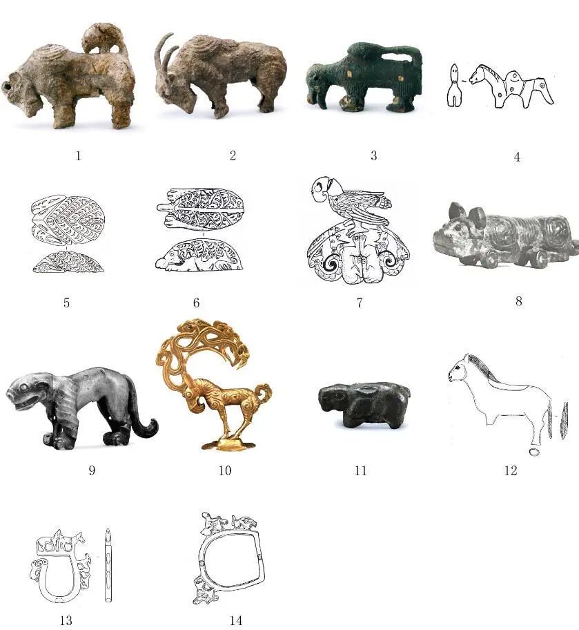欧亚草原地区范围非常大,动物纹装饰与中国北方和新疆地区联系最为密切。中国北方和新疆地区动物纹装饰主要与“内陆亚洲山麓地带”的联系较为密切,虽然同属于内陆亚洲山麓地带,但其下不同区域动物纹装饰的分布和影响并不一致。刀剑上的兽首装饰和立体羊形饰反映的是米努辛斯克盆地与中国北方地区的联系;虎噬食草动物纹、翻转动物纹、神兽题材动物纹反映了中国北方和新疆与阿尔泰地区的交往;北山羊饰牌的传播则反映了中国北方与天山七河地区的联系。