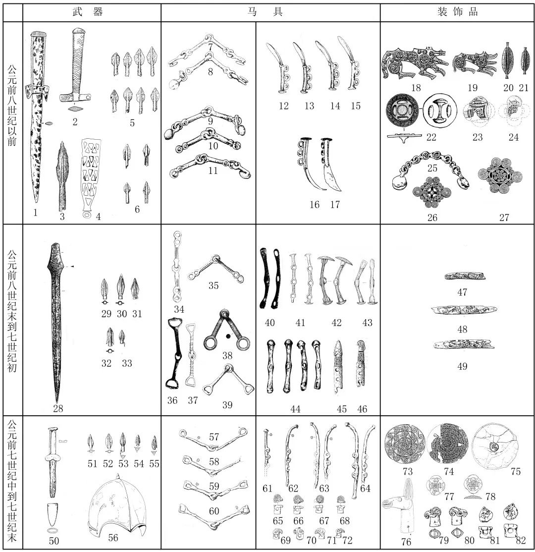 不仅如此,中国北方与内陆亚洲山麓地带各区域动物纹装饰交往的时代也不相同。最早是与北面的米努辛斯克盆地和图瓦地区的联系,从晚商时期刀剑的兽首装饰到西周晚期至春秋早期夏家店上层文化的卷曲动物纹和排鹿纹装饰,再到春秋时期的立体羊形饰和双鸟回首短剑,都反映了中国北方与这一地区的交往;然后是中国北方与阿尔泰地区,主要是巴泽雷克文化的联系,年代主要集中在战国时期,神兽题材、翻转动物纹和虎纹以及虎噬食草动物纹等是两地联系的重要证据;最后是中国北方与天山七河地区的联系,年代已经在公元前3世纪之后,北山羊饰牌的传布以及伊塞克古冢和马家塬墓地的联系都是其交往的重要佐证。中国北方地区与米努辛斯克盆地和阿尔泰地区的联系可能主要通过蒙古西部到内蒙古西部的草原通道,而最晚的中国北方与天山七河的联系则主要通过天山通道,这也是后来汉唐丝绸之路的重要路线之一。从米努辛斯克盆地到阿尔泰再到天山七河地区,交往路线不断南移的过程,反映了从草原之路到丝绸之路的历史进程。