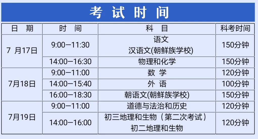 考试科目:初二地理、生物和初三语文(含汉语文、朝语文,下同)、数学、外语、物理、化学、道德与法治、历史、体育学科为毕业与升学考试科目。