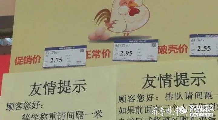 6月1日上午9点,济南市华联超市鸡蛋销售区前,十多个顾客有序排队购买鸡蛋。华联超市日常鸡蛋销售价为2.95元/斤,今日促销价低至2.75元/斤,每人限购3斤,排队的顾客人人都选择称上三斤。
