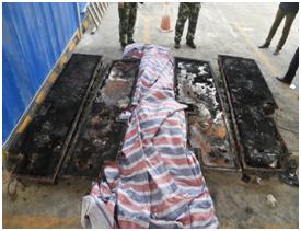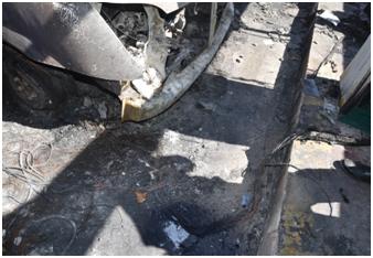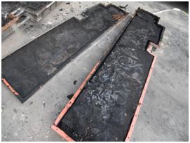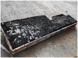 火灾原因远没有我想象的那么简单,调查工作再次陷入迷茫。这时我第三次来到现场重点对4号电动汽车进行勘验。通过对4号汽车铁质构件以及该车后货箱的货物倾倒状况进行勘验,所有的痕迹都指向了电动汽车左侧电池舱的部位。