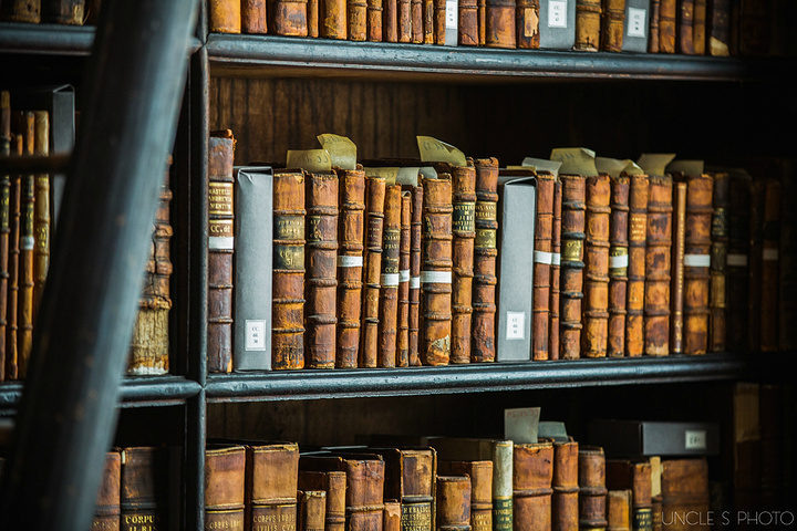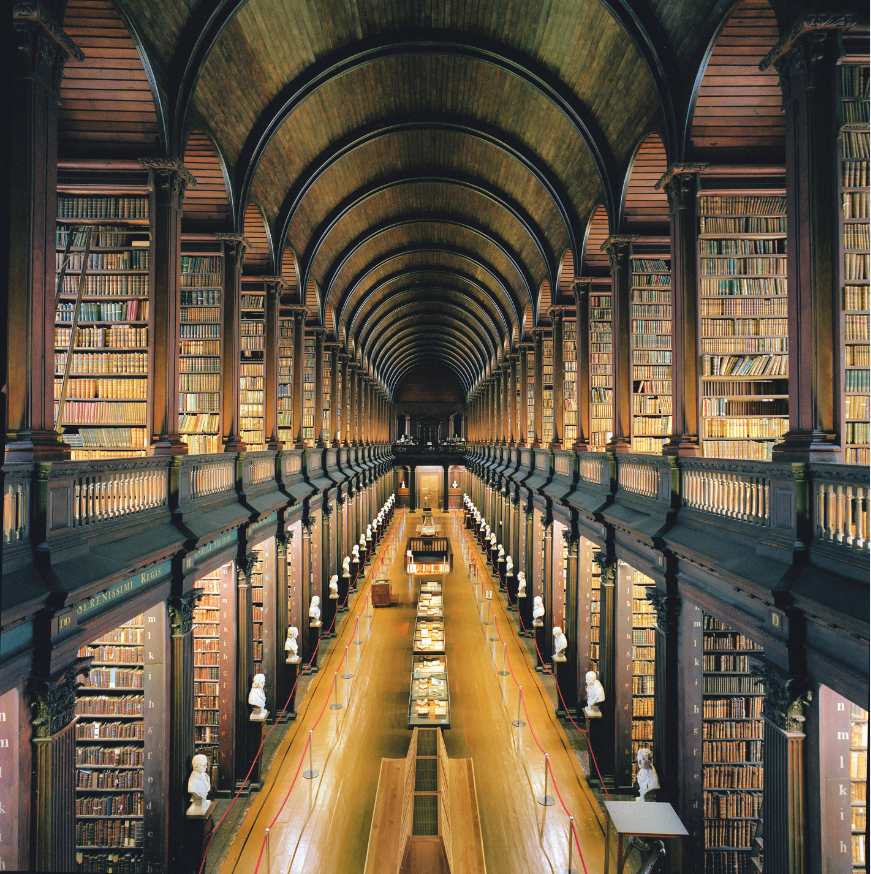 “哦,跟我来吧。”他用爱尔兰人特有的轻快语调说道。我不禁怀疑此人是专门奉派来迎候我的。他引领我直奔写着“仅供出口之用”的主楼梯,进入了“长厅”(Long Room )的正中央。所谓“长厅”,就是三一学院图书馆的昵称,这是一个辉煌且精美的木制藏书室,由建筑师托马斯·伯夫(Thomas Burgh )于1712~1732 年设计。他最初设计的容量是十万册书稿,不过,在19 世纪中期时人们为其增设了多个夹层回廊,用于放置镀金且皮革装帧的书稿,从而将藏书量提升了一倍之多,并且将藏书空间从底层一直扩展到了穹顶。这样的场景实在壮观。连我的向导都停了下来,以确保这震撼效果有充分的时间透入我的心灵。