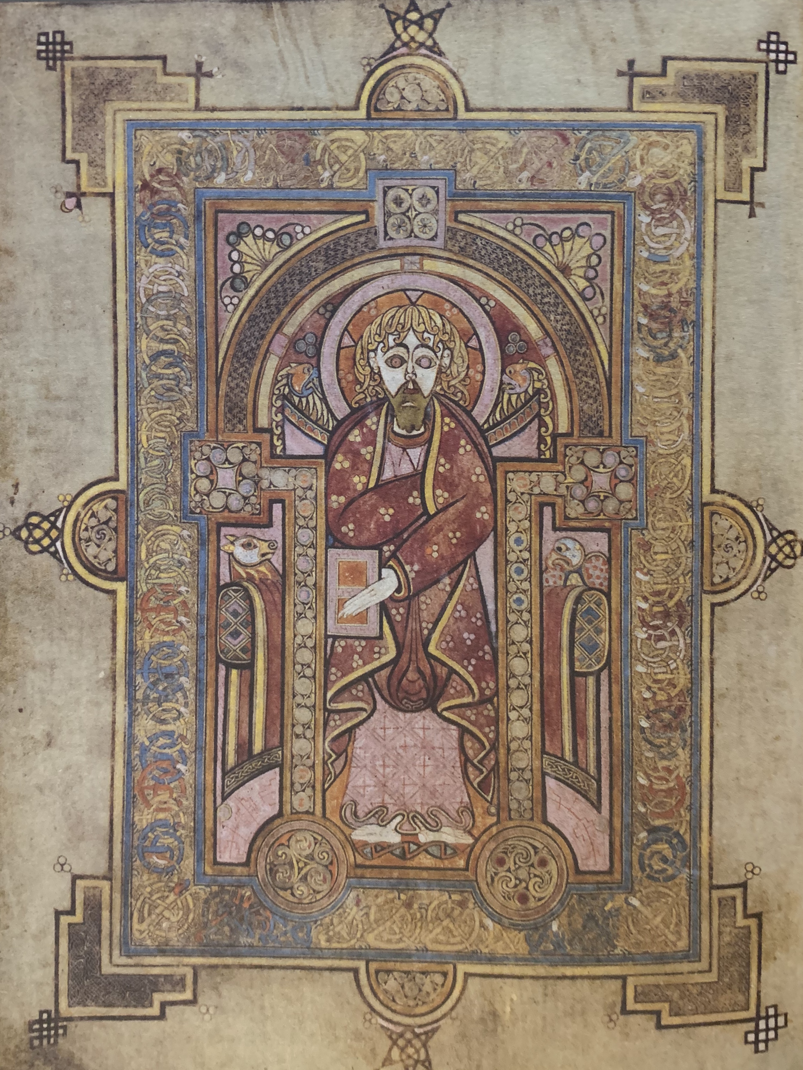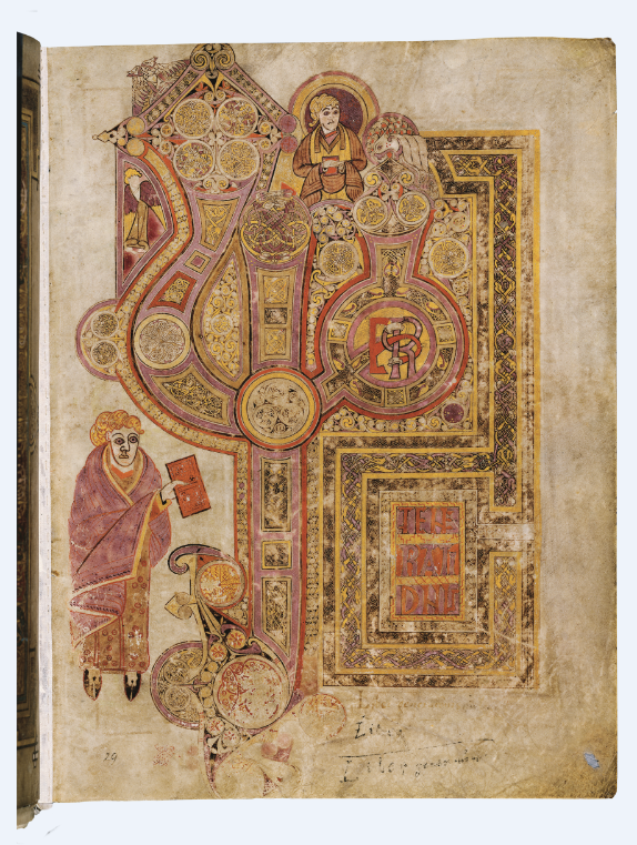 《凯尔经》的第一张插图所展示的是四福音书作者的象征物,马太的象征物是手持书册的天使,一头有翼且长舌的狮子代表马可,路加的象征物是一头牛,约翰的象征物则是一只鹰。