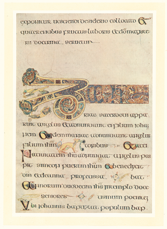 这之后的内容是《马太福音》的传统引言,引言以一个巨大的方形首字母开篇,字母上方绘有一个吃惊不已的人正向外窥视的场景,就如同海边的沐浴者躲在毛巾后面窥探海滩上的情形一样。再往后便是《马可福音》的章节概要和引言,之后是《路加福音》和《约翰福音》的引言,然后又跳回《路加福音》和《约翰福音》的章节概要—这个部分采用了红色和紫色的文字,装饰得相当华美;最后则是《马太福音》的引言插图,这里再次出现了四个福音书作者的象征物(都在各自的华美的方框里面手舞足蹈),以及一整页的圣马太站立画像(第28 对开页的左页)。图里的圣马太就那么直直地盯着读者,左手持书册,右手则伸入罩袍当中,就像拿破仑一样。其罩袍是紫色的,上面点缀着黄色斑点。尽可以将这样一个人物想象成幽灵,就在一堆抖动着的饰品以及眼露凶光的野兽中间幻化而出。他仿佛飘浮在空中,因为他的脚是朝外的,罩袍的褶边也在抖动。这一页已经很暗淡了,必然是在过去的千年时光里被展览并且触摸过无数次了。