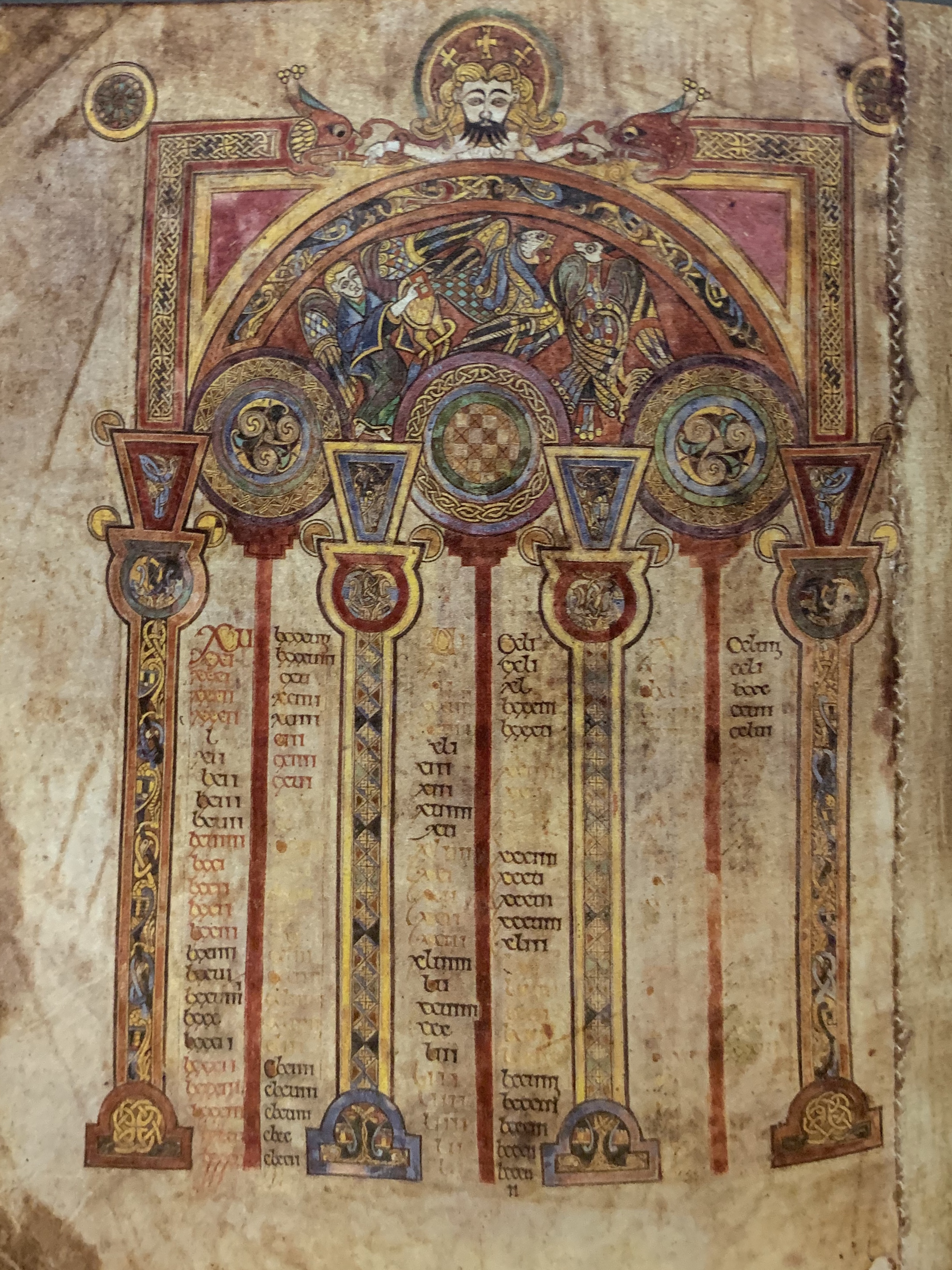 抄本第一页的第二栏呈现了《凯尔经》的第一张插图,不过这张图现在已经变成黄褐色,看起来相当陈旧了,令人很难辨识其内容。插图是卧排的,似乎历来人们都是从右侧欣赏的。抄本当中有许多小画像似乎朝着错误的方向,这是其中第一幅。不难想象,在8世纪,人们蜂拥而来,群集在抄本周围,从各个方向凝视这份抄本;或者,这是为上帝提供的视角。这张褪色的插图所展示的是四福音书作者的象征物,《圣奥古斯丁福音书》里面也有这样的画像:马太的象征物是手持书册的天使,一头有翼且长舌的狮子代表马可,路加的象征物必定是一头牛(尽管在这份抄本里已经很难辨识清楚了),约翰的象征物则是一只鹰。这是这份抄本当中最常见的一类画像,它们在这里成了福音正典表前面的卷首插画的一部分。