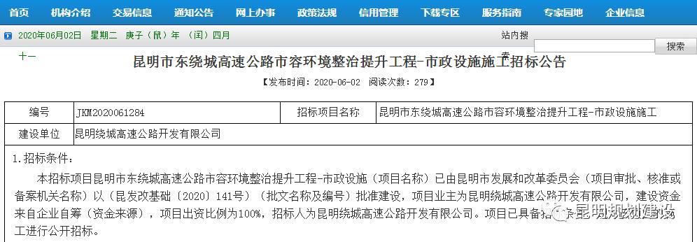 昆明市公共资源交易平台于今日发布《昆明市东绕城高速公路市容环境整治提升工程-市政设施施工招标公告》,根据招标文件,该工程工期为60日历天。