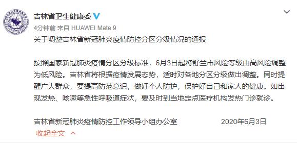 按照国家新冠肺炎疫情分区分级标准,6月3日起将舒兰市风险等级由高风险调整为低风险。
