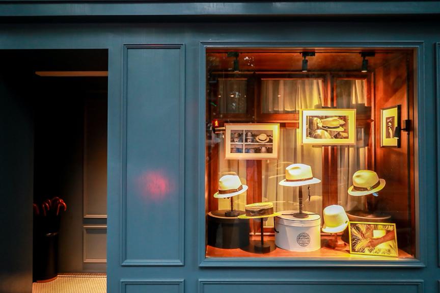 走过复兴中路汾阳路路口,能看见HATS&CAPS 店面橱窗里陈列着各大老牌帽厂的春夏草帽 - 有意大利的Bosalino皮饰巴拿马草帽,Tesi马术风格草帽,Lock&Co. Hatter平顶草帽,与烟灰色的门头对比呈现出上世纪20年代的风格,与前法租界上的梧桐树和谐相融。