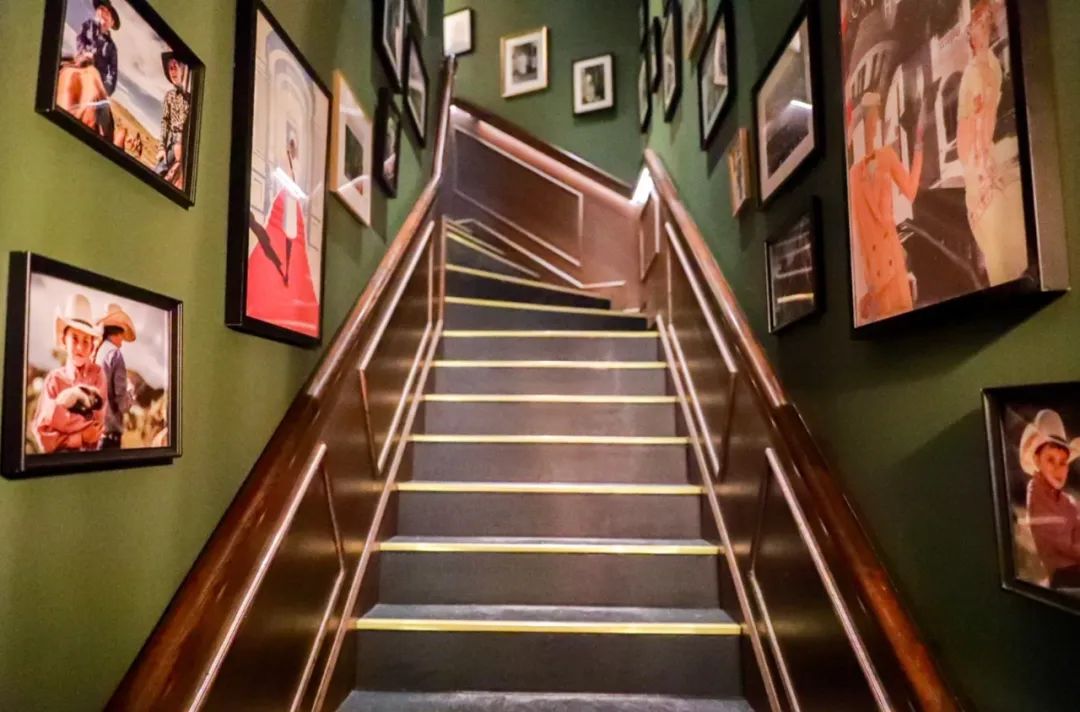 酒吧的帽子主题鲜明统一,在通往二楼的途中,能看见步梯两侧墙上与酒吧主题紧紧相扣的各种和帽子相关的电影剧照、艺术作品,折射出HATS&CAPS的艺术灵感。