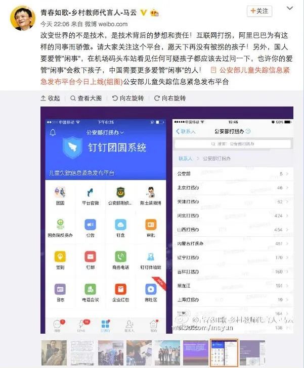 改变世界的不是技术,是技术背后的梦想和责任。互联网打拐,阿里巴巴为有这样的同事而骄傲。……也许你的爱管“闲事”会救下孩子,中国需要更多爱管“闲事”的人。