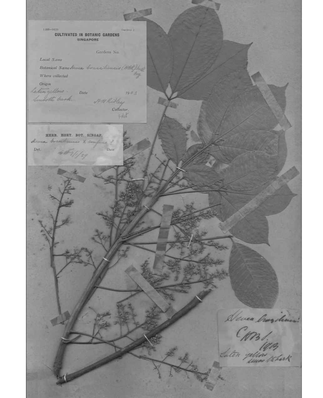 19世纪末,里德利开始在新加坡植物园内种植橡胶树三叶胶,并对树木进行密集的试验计划,力求找出树木的最佳培养环境和对乳胶的收割/敲击方法。
