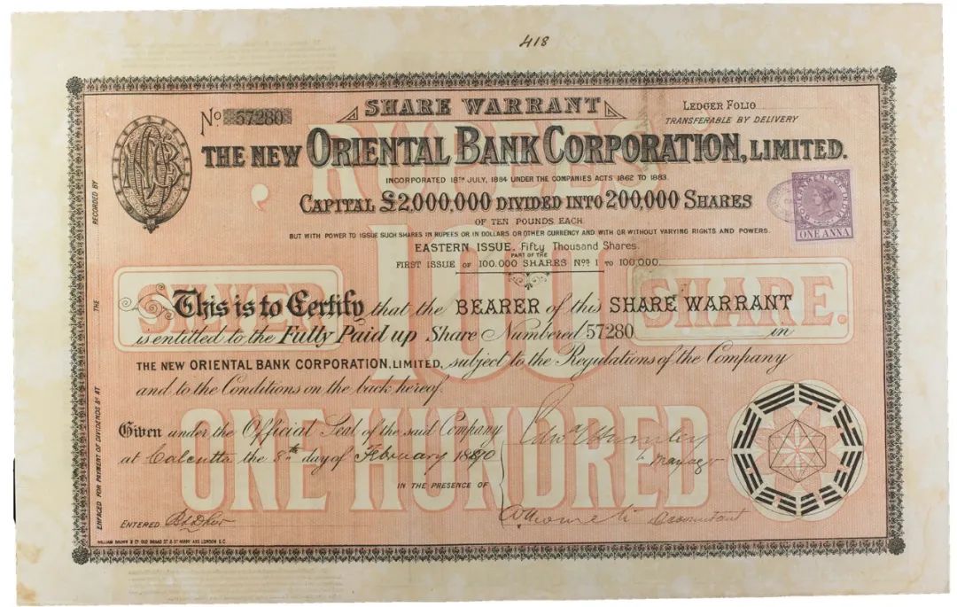 丽如的前身是英商成立于印度孟买的BANK OF WESTERN INDIA(西印度银行),代理在东印度贸易的结算和汇划等业务。1845年,银行的总行从印度搬回伦敦,改名东方银行(ORIENTAL BANK)。又在香港和上海开设分行,香港的分行叫“金布银行”(又称“金宝银行”),缘于总经理的名字PATRICK CAMPBELL。上海被唤为“丽如银行”也与总经理有关,他叫WILLIAM LAMOND。1851年,丽如银行由原名ORIENTAL BANK换成ORIENTAL BANK CORPORATION,我看到的那张1852年发行的丽如银行股票,印的就是这个名。