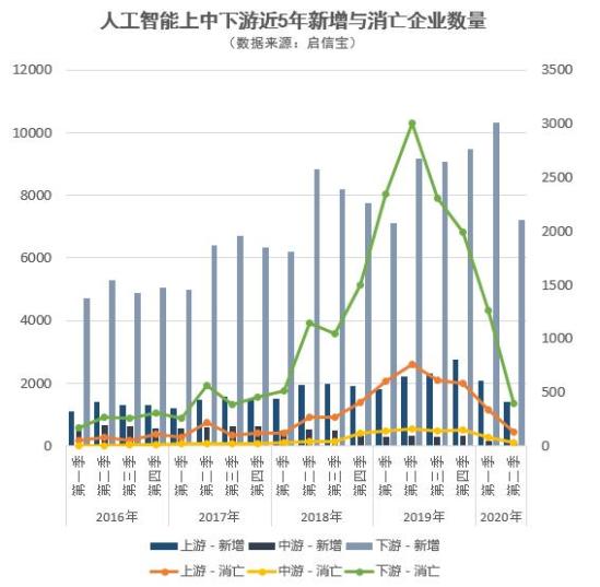 从企业新增来看,2016年以来,人工智能产业链下游企业,每年都迎来大幅增长,势头明显。尤其是近一年来,下游企业发展态势比上游、中游旺盛。