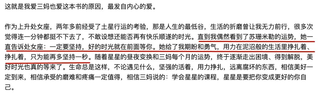 除了在内容上给大家提供实用价值以外,三妈的星座运势还总是在正能量的准线边上立定跳远,鼓励也好,慰勉也罢,总能用恰到好处的正向鸡汤为大家提供情绪价值。