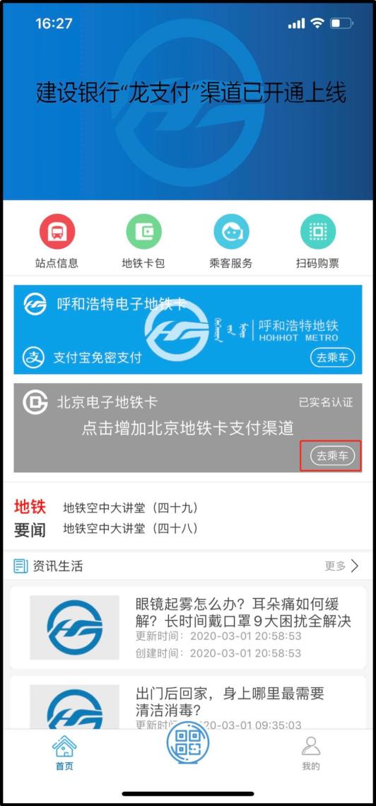 当乘客完成绑定支付渠道操作流程后,即可在“青城地铁”APP首页点击“北京电子地铁卡”按钮跳转至“城市服务页面”,在“城市服务页面”切换当前城市为“北京”后点击【去乘车】按钮,将弹出对话框提示乘客“确定开通北京二维码乘车服务”,乘客点击【确定】按钮即可使用乘车。