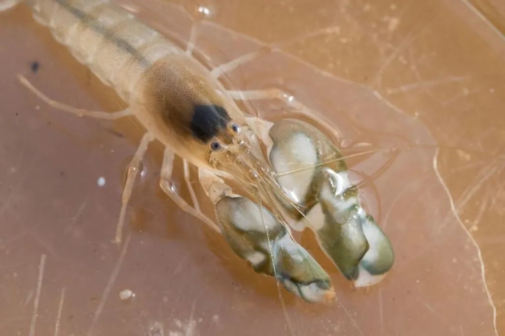 虾如其名,与众不同的大螯就是它的"手枪",枪虾会以超高速闭合它的"手枪",挤出的水柱冲击周围水体产生气泡,气泡瞬间爆裂,发出"枪声",同时伴随冲击波,一下击晕它们的猎物。此外,枪虾还会用这些声音来交流。所以,当珊瑚礁里的很多只枪虾都在捕食、交谈,"噼里啪啦"就成了珊瑚礁的背景声。