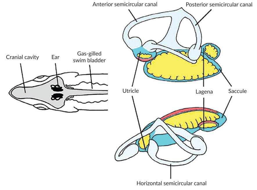 几乎所有的鱼类都能听到声音。由于鱼类身体的密度和周围海水相当,它们无需收集声音的外部结构(不似在陆地上的我们,有外耳和中耳),一双位于颅腔内鱼脑旁的内耳就是它们的听力器官。内耳中有三对钙质的耳石,紧靠着感觉表皮,负责听觉的产生。