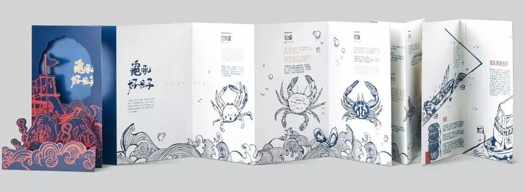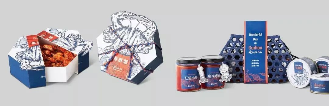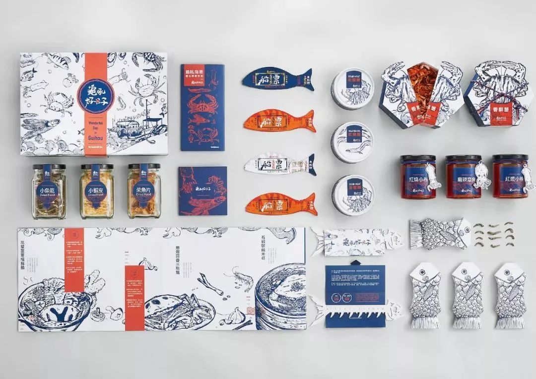 这款海鲜食品的包装设计,堪称丰富又充满灵魂!无论是深海蓝的运用,还是与食物呼应的鲜肉红,激起顾客的味蕾简直不要太轻松,还有绑绳、网兜的设计演变也增添了些许小趣味!