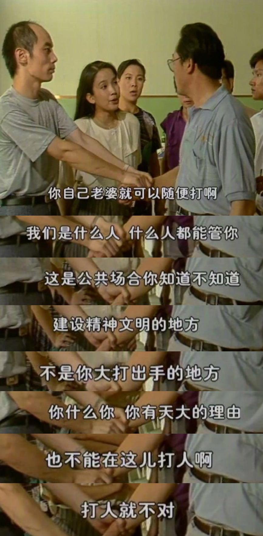 他们之间发生了一段关于“我打自己老婆,你凭什么管”的对话。