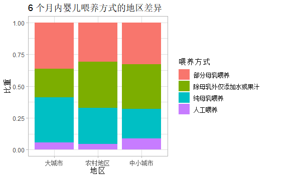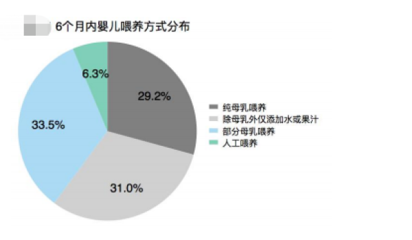 2019年2月,中国发展研究基金会发布的《中国母乳喂养影响因素调查报告》针对 1 岁以内的婴儿,考察了 0-5 月龄(即 6 个月内)婴儿的纯母乳喂养、6-11 月龄婴儿的继续母乳喂养以及婴儿出生后 1 小时内早接触早开奶的情况。该项调查数据显示: 在大城市6 个月内婴儿纯母乳喂养率最高、其次为农村地区、中小城市。根据中国发展研究基金会2019年2月份发布的《中国母乳喂养影响因素调查报告》,中国婴儿6个月内纯母乳喂养率为29%,低于43%的世界平均水平和37%的中低收入国家平均水平。其中,大城市的纯母乳喂养率最高,达到36%;而最低的中小城市仅为23%。