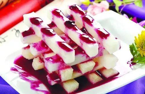 4、将经浸泡的山药条按照自己喜欢的方式摆在盘中,用适量的蓝莓酱淋在山药条上即可