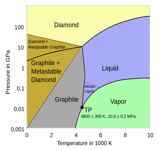 就像水可以变成冰一样,无非就是让C原子重新排列一下。根据C的相图我们可以得到只要温度和压力控制在一定条件下,例如我们将压力控制在4.5~6.0GPa,温度在1100℃~1500℃,石墨就会变成钻石。