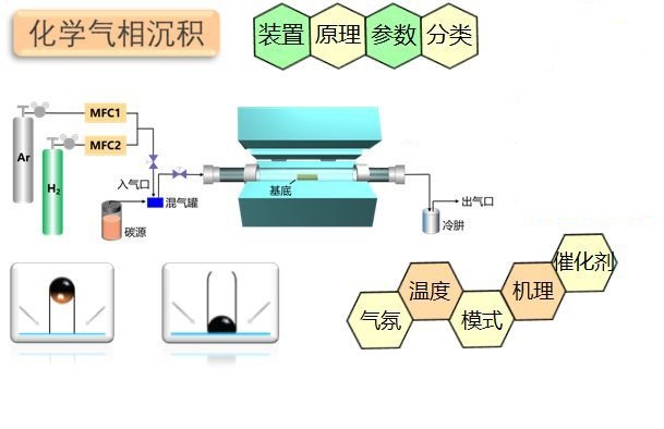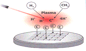 CVD法:以低分子碳氢化合物(CH4、C2H2、C6H6等)为原料所产生的气体与氢气混合(有的还加入氧气),在一定的条件下使碳氢化合物离解。在等离子态时,氢离子相互结合成的氢气被抽真空设备抽走,剩下的碳离子带正电荷。在钻石或非钻石(Si、SiO2、Al2O3、SiC、Cu等)的衬底上通负电,在电场的引导下,带正电荷的碳离子就会向通负电的衬底移动,最后沉淀在衬底上,并按照钻石晶格生长规律在衬底上生长出钻石。其中以钻石为衬底生长钻石的CVD方法也叫做外延生长法,它按照钻石籽晶的晶面参数不断地堆积生长,故生长单晶钻石必须用CVD外延生长法。