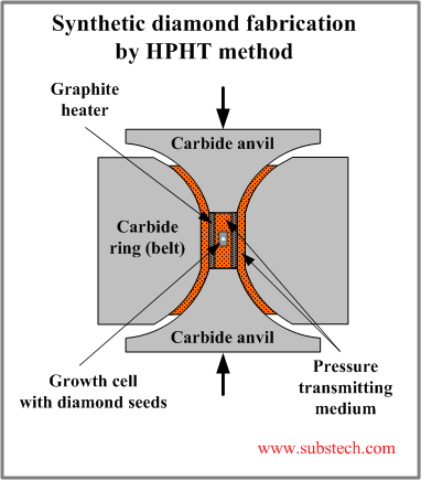 HPHT法:模拟地壳底下的高温高压环境,在高温高压下,将石墨融到融化了的金属触媒里面。将石墨与液态金属施压到一定的压力和提升到一定的温度,例如:5.5万个大气压力,1400℃~2500℃,所有的石墨都会溶解到熔融了的金属触媒中,并转变为跟天然钻石成分与结构几乎一模一样的钻石。