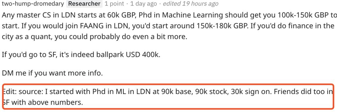这位答主现身说法,他自己在博士刚毕业时的待遇为年薪9万英镑年薪+9万英镑股票+3万入职奖金。
