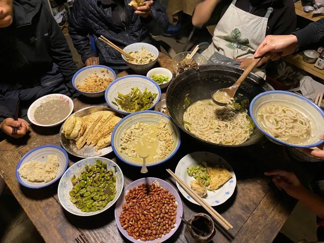 我们被邀请入座,棠棠翻出几双长短不一的筷子,让我们凑合着用。我拿过一个瓷碗,发现碗底沾了粒小石子,将它擦去。桌上的菜摆了满满一桌,其中有一口很深的铁锅,盛着粗细不均的手工面条,某种认不出的菜叶子混在里面。我问了一句,老贾回答说,“最近青黄不接,没什么蔬菜,所以只能把花菜叶子也拿来吃了。”